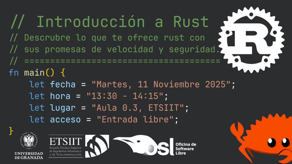 El pr贸ximo martes 11 de Noviembre, a las 13:30 en el aula 0.3 de la Escuela T茅cnica Superior de Ingenier铆a Inform谩tica de la Universidad de Granada podreis asistir a una charla introductoria al lenguaje de programaci贸n Rust, donde nos centraremos en explicar como se diferencia de otros lenguajes (C++, python, java…) y los motivos tras estas diferencias con ejemplos practicos.